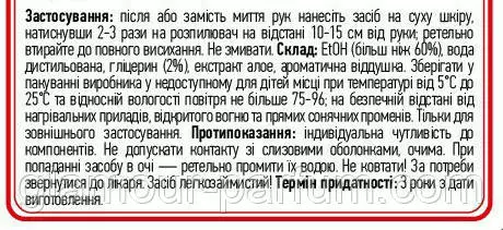 СКЛАД: ЕtOH (більш ніж 60%),ведення дистильоване, гліцерин (2%) екстракт алое, ароматичне запашне запашник. Зберігати в пакованні виробника в недоступному для дітей місці за температури від 5 °C до 25 °C і відносної вологості повітря не більш ніж 75-96%; на безпечній відстані нагрівальних приладів, відкритого вогню та прямих сонячних променів. Тільки для зовнішнього застосування.