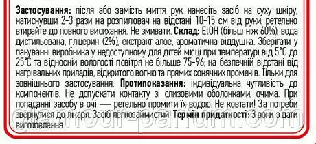 Дезінфектор для рук, антисептик. Препарат для гігієнічної антисептики та дезінфекції рук. Гліцерин у складі оберігає руки від пересушування й підтримуватиме еластичність шкіри. Пройшов дерматологічні тестування.