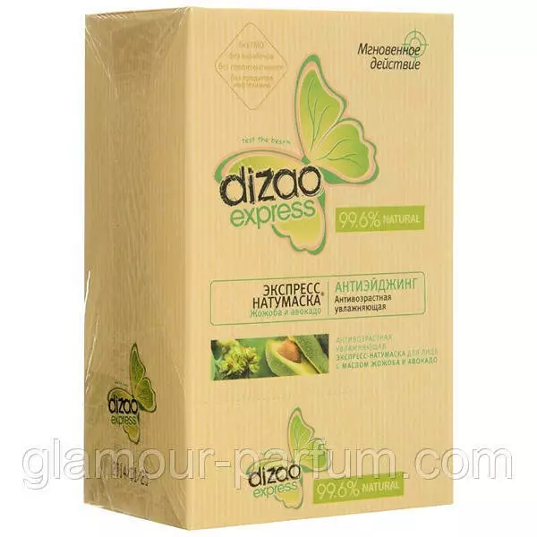 Створена з урахуванням індивідуальних потреб шкіри, ця експрес-маска Dizao Natural інтенсивно зволожує й розгладжує шкіру за допомогою ніжних олій жожоба й авокадо. Ці натуральні компоненти надають видимий антиейдж-ефект, а Вітаміни А й Е забезпечують регенерацію та зміцнення шкіри. Сяйво та краса шкіри від Dizao Natural — лише за кілька хвилин!
