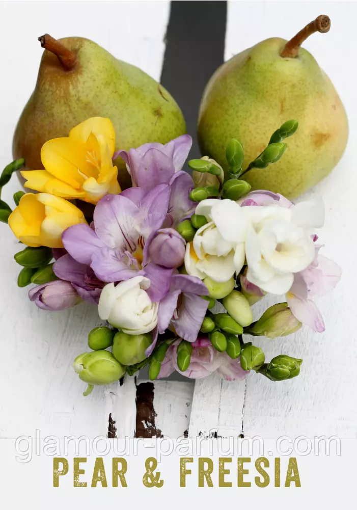 Нюанси фрезії та груші дуже складні та вміло доповнюють один одного. Груша в момент досконалої стиглості має хрустку структуру шкіри та соковиту, медову м'якоть. Аристократичне звучання фрезії обрамляє її, залишаючи простір для тонких нюансів дикої троянди. М'яка база огортає теплом золотої пори.