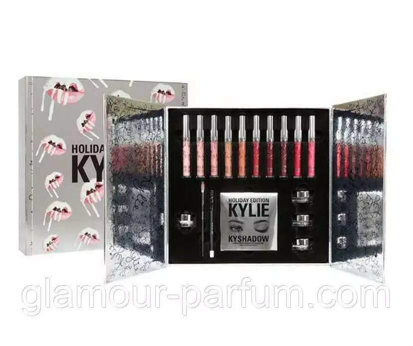Усередині набору ви знайдете 10 ультрасучасних відтінків рідких матових помад Kylie, палітру тіней Kylie з 9 модними відтінками , що фіксують пігментовані гелі для брів у 4 натуральних коричневих відтінках, а також зручний пензлик для їх нанесення, і білий перламутровий олівець для створення акцентів вашого макіяжу. Такий комплект дає змогу вигадувати незвичайні та яскраві образи і кожен день дивувати оточення своїм розкішним зовнішнім виглядом. Косметика вирізняється високою стійкістю, тому не обсипається, не скочується.