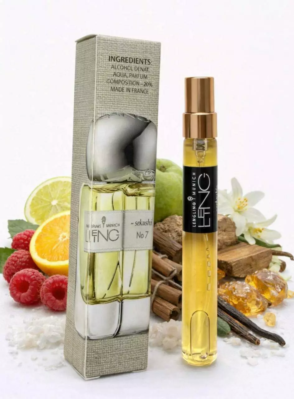 Lengling Munich Sekushi No.7 — це провокаційний і багатогранний аромат, який відкривається ігристими, солодкими нотами персика, малини та бергамоту, поступово розкриваючись тёплим, насиченим серцем із пачулі, мускусу та жасмину, а в базі звучить тепла ваніль, глибока амбра й благородний сандал, створюючи спокусливий, багатий і стійкий шлейф, що ідеально підходить для вечірніх виходів, особливих моментів і тих, хто цінує контраст солодких фруктів і темної, чуттєвої шкіри — солодкість і зухвалість в одному флаконі.