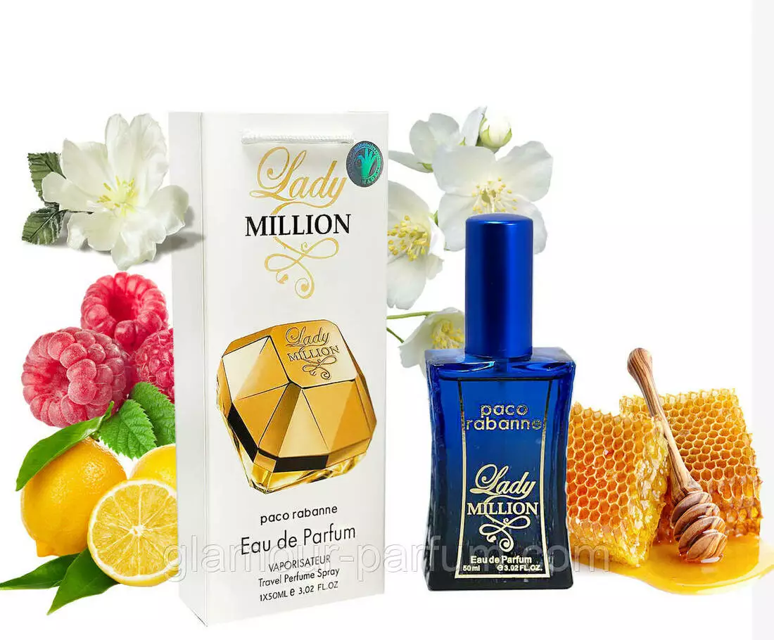 Пако Рабан одного разу сказав: «Жінки завтрашнього дня будуть дуже ефективними і спокусливими. І, безсумнівно, вони будуть краще... чоловіків!» Леді сучасного світу володіють досконало своєю головною зброєю – духами, вони взяли його під контроль і тепер всі карти знаходяться у них в руках! Для цих розкішних «амазонок» Дім Paco Rabanne створює екстравагантний Lady Million – жіночу версію, покликану стати продовженням історії для чоловіків «1 Million». Фатальні красуні і бунтівні спокусниці, яким ніхто не може протистояти, і які точно знають, що їм потрібно, воліють золото і коштовності. Lady Million – це їх щасливий талісман, яким вони завжди мріяли заволодіти! Верхні ноти: апельсин, малина, неролі. Ноти «серця»: флердоранж, арабський жасмин, гарденія. Базові ноти: мед, пачулі.