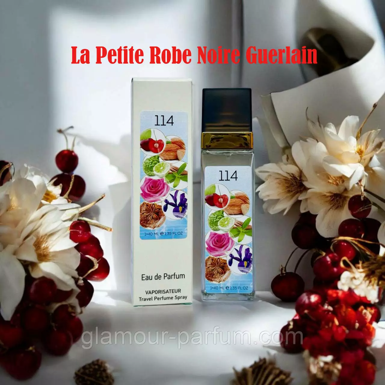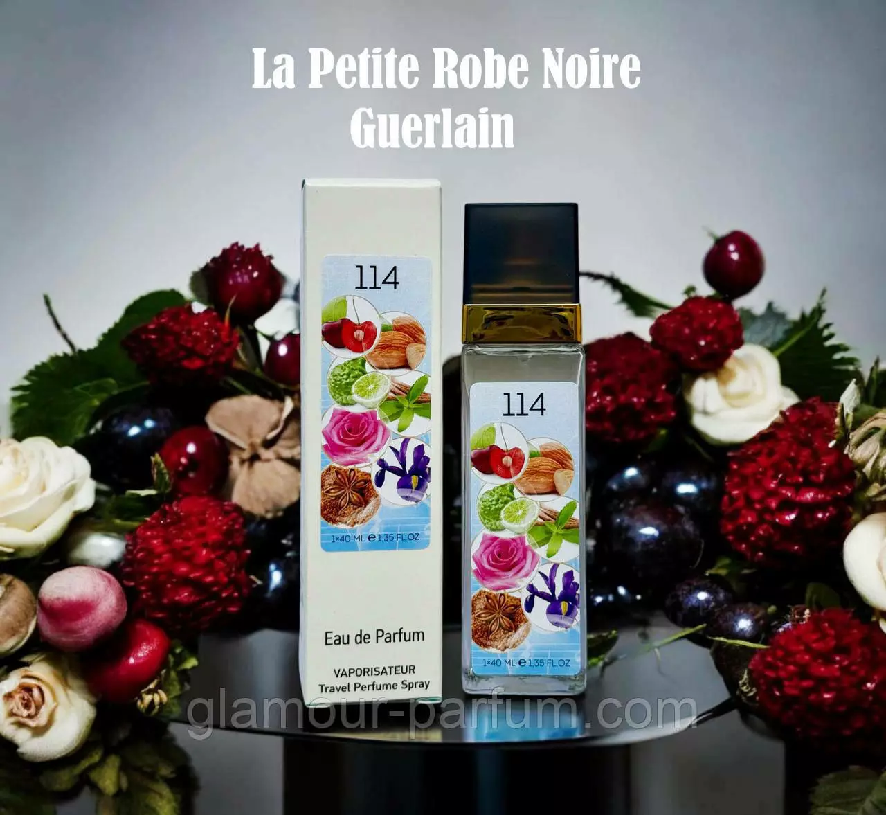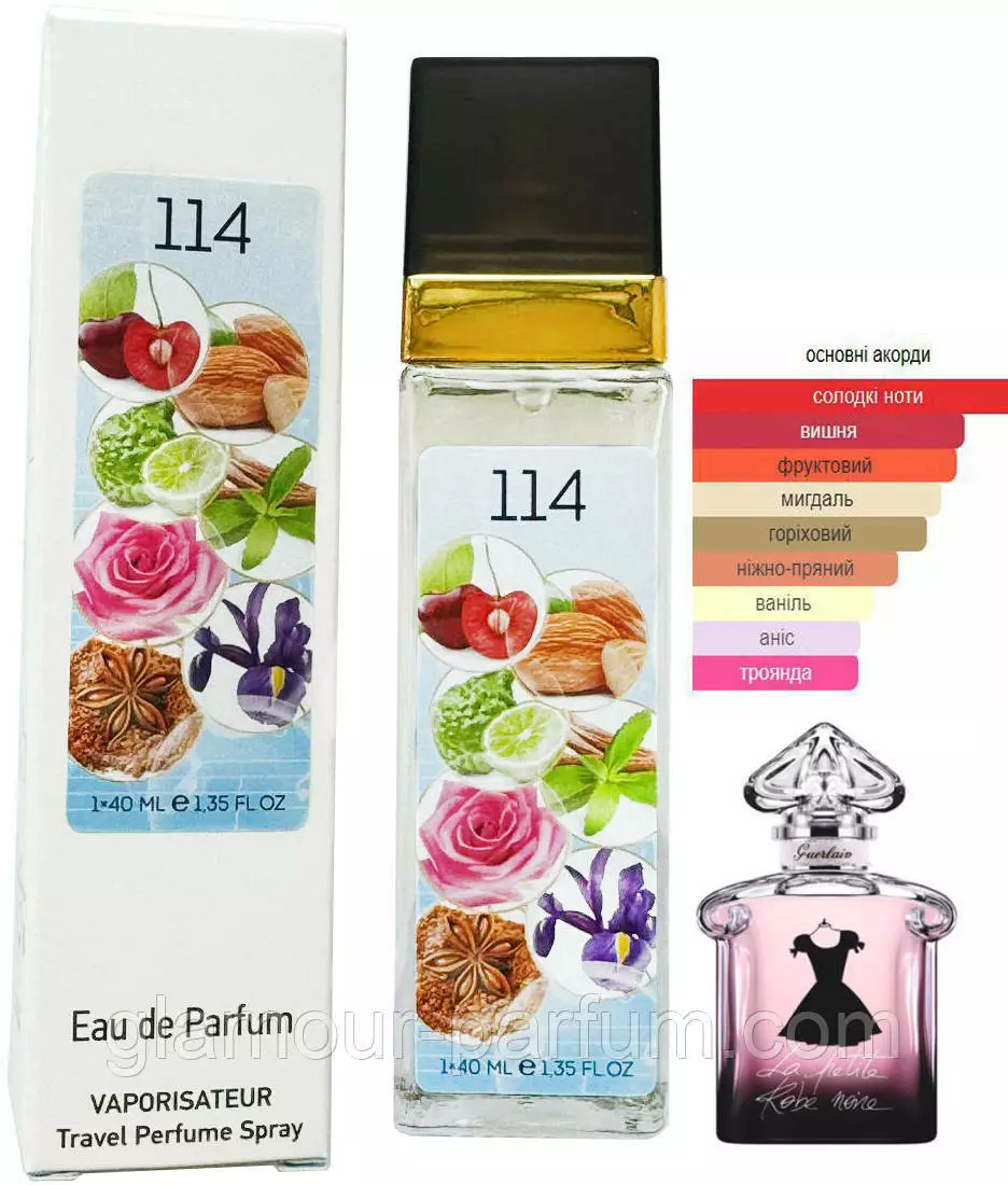 Гарний, легкий, світлий – такими словами характеризують парфум № 114 за мотивами La Petite Robe Noir (Ла Петіт Роб Ноір) Його букет складається з багатої палітри нот. Перше знайомство починається з нюансів мигдалю, солодощі червоних ягід і вишні, свіжість бергамота. В серці La Petite Robe Noir розкриваються пікантні троянди і солодка, невелику гірчинку вносить чорний чай. Шлейф огортає прохолодними нотами пачулі і анісу, а ваніль з квітами ірису пом'якшують їх.