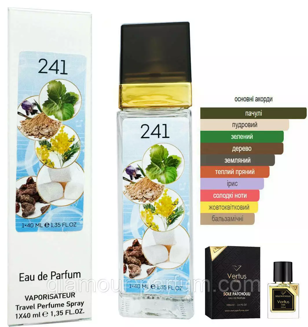 Хочете купити Парфум № 241 за мотивами Sole Patchouli Vertus (Соле Пачулі Вертус) 40 мл. ОПТ в Україні онлайн? Зробіть замовлення в нашому інтернет – магазині Гламур Парфум «»: через корзину або по . Розібратися в особливостях тієї чи іншої парфумерії, а також косметики, із задоволенням допоможуть доброзичливі менеджери.