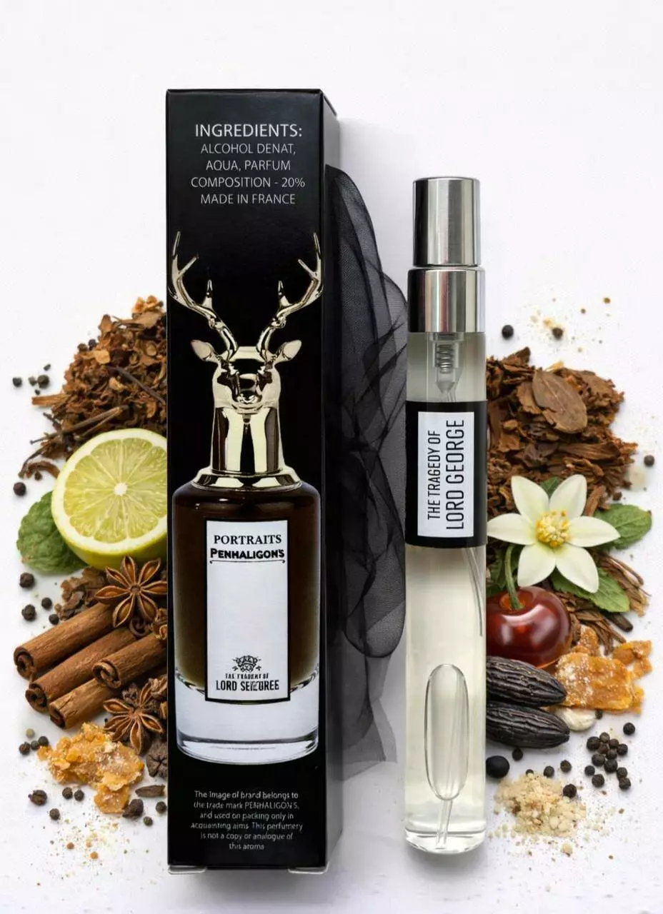 Penhaligon's The Tragedy Of Lord George — це глибокий, насичений і статусний аромат з характерним тютюново-ромовим звучанням. Він відкривається цитрусово-пряними нотами бергамоту, гвоздики та чорного перцю, створюючи атмосферу сили і впевненості. У серці композиції домінує тютюн у поєднанні з деревними нотами кедра та акцентами рому, що додає благородства та глибини. База з ванілі, бобів тонка та мускусу забезпечує теплий, стійкий і оксамитовий шлейф. The Tragedy Of Lord George звучить розкішно, стримано й мужньо — аромат для справжніх джентльменів ????????.