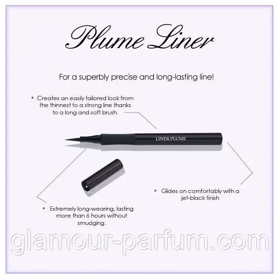 Підводка чудова тим, що з її допомогою можна провести на повіках чітку, ультратонку лінію. Чим тонший пензлик, тим тонший буде лінія. Можна не побоюватися того, що засіб розмивається за будь-якого неакуратного руху: підводка сохне за лічені секунди. Крім того, вона досить довго тримається. Чарівна підводка для очей Lancome Liner Plume (Ланком Лаїн Плюм) має бути у вашій косметичці!