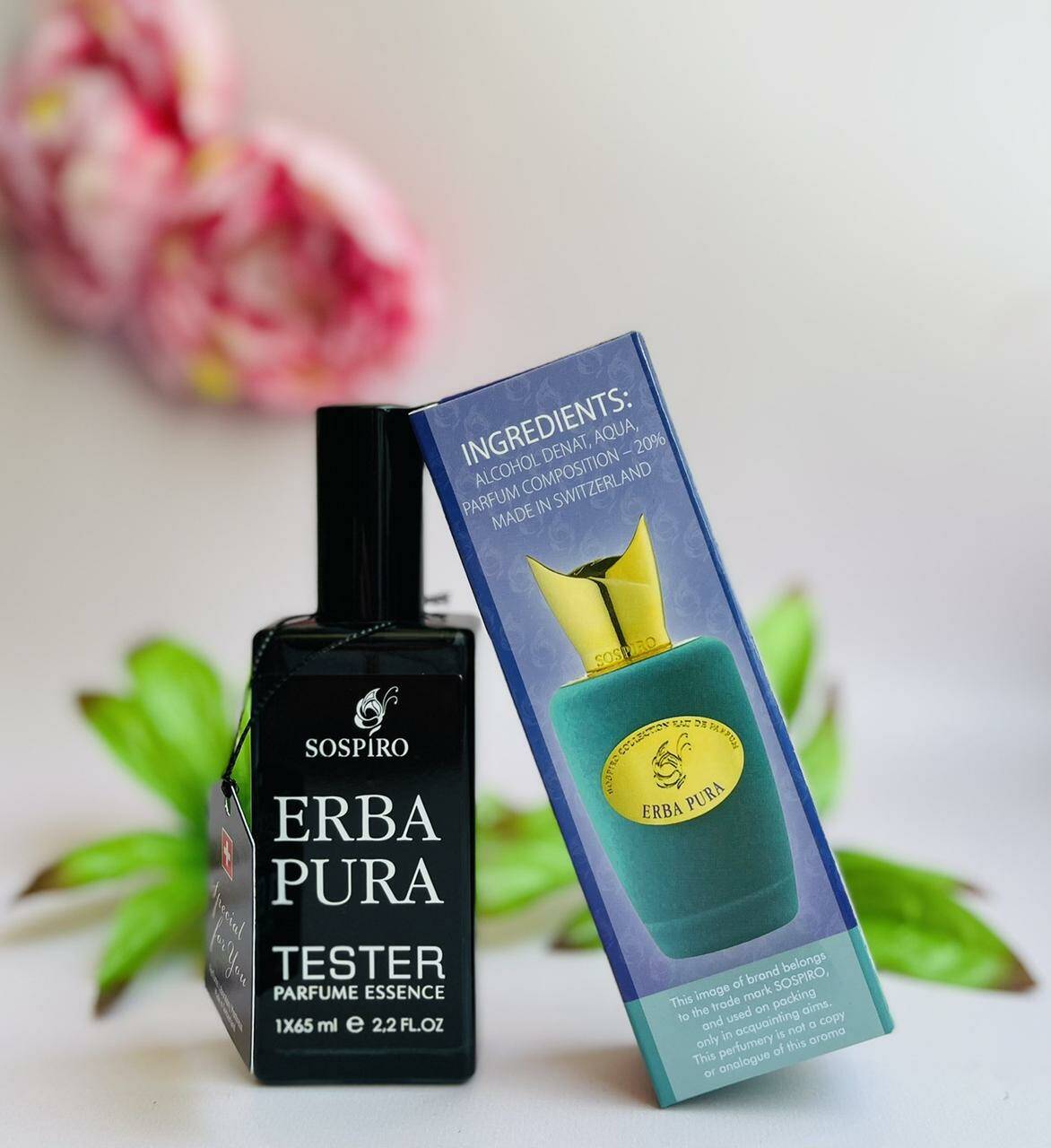 Erba Pura – абстрактний, м'який, шалено сучасний парфум, в якому переплітаються середземноморські акорди солодких цитрусів з гурманськими, теплими і чуттєвими східними ароматами. Побачила світ в 2013 році. М'який аромат належить до родини квіткових фруктових букетів, він огортає своїх власниць орієнтальним серпанком теплих східних пахощів і середземноморськими запахами цитрусів. Ті, хто, "одягає" на себе Erba Pura (в перекладі звучить як «чисті трави») - сучасні і чарівні, незалежні і привабливі, вільні і самостійні. Абстрактний аромат укладений у ексклюзивну фірмову непрозору пляшечку насиченого фіолетового кольору, увінчану кришечкою у вигляді золотої корони. На флакон нанесені золотисті орнаменти. Неординарний "носибельный" аромат з прекрасним довгим шлейфом, яскравий і гучний. Летить композиція дуже схожа з прогулянкою по річним зеленим лугам. Італійка за походженням, Sospiro Perfumes Erba Pura несе невичерпне джерело енергії та позитивний настрій на цілий день.