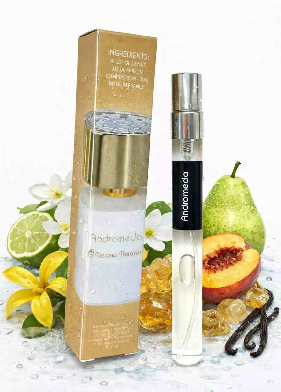 Tiziana Terenzi Andromeda — це ніжний, повітряний і дуже чуттєвий аромат із космічною елегантністю. Він відкривається свіжими цитрусово-водяними акордами з екзотичним іланг-ілангом, створюючи відчуття чистоти й легкості. У серці композиції звучать соковита груша, персик і жасмин, надаючи аромату солодкої м’якості та жіночності. База з білого мускусу, ванілі, кашмерану та амбри формує кремовий, шовковий і дуже стійкий шлейф. Andromeda звучить ніжно, дорого й магнетично — аромат, у який легко закохатися ✨????.