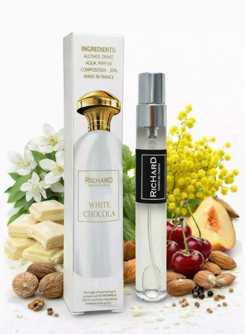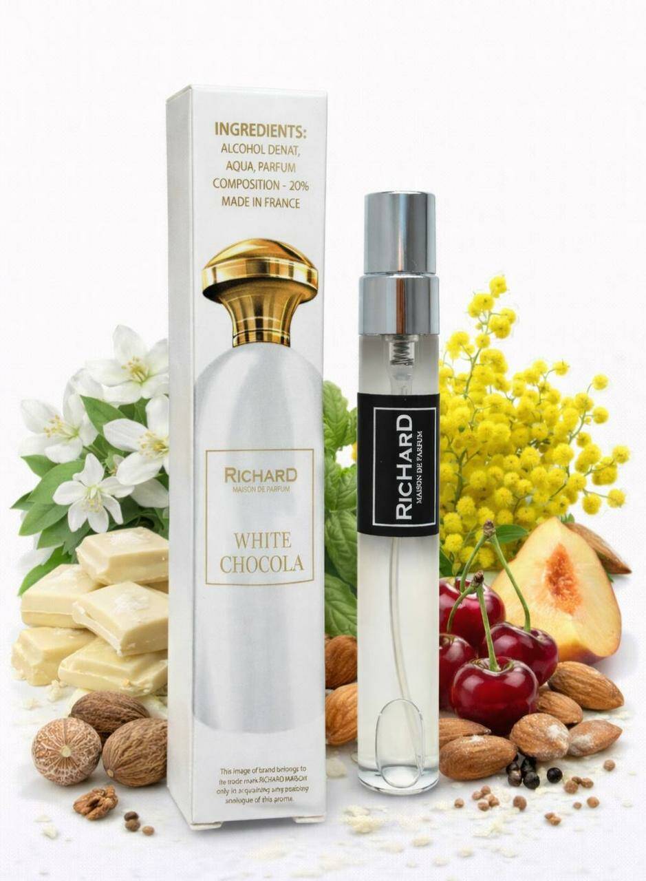 White Chocola Richard — це насичений і спокусливий гурманський аромат з оксамитовим характером. Він відкривається кремовими нотами білого шоколаду та м’якої ванілі, створюючи відчуття тепла й комфорту. У серці композиції розкриваються глибокі шоколадні й вершкові акорди, що додають аромату солодкої чуттєвості. База з мускусу, сандалу та амбри робить звучання глибоким, стійким і дуже привабливим. White Chocola звучить інтимно, дорого й обволікаюче — ідеальний для холодної пори року та вечірніх моментів ????????.