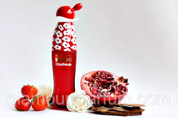 Насичений квітковий фруктовий коктейль заворожує своєю емоційною й барвистістю. Привабливий букет побудований на домінуванні червоного кольору, який проявляється на кожному етапі розкриття звучання та краси. Гранат, суниця та червоний імбир розкриває енергетику букета, а після переходить до пахучого серця, побудованого з запашної гарденії, водяної лілії та червоної орхідеї. Чарівний коктейль Moschino Chic Petals у базових акордах виблискує чуттєвістю мускусу та терпким теплом дерева Хінокі, приправленого солодкістю розкішного ірису. Чудовий аромат кружляє голову та привносить особливу витонченість у образ. Це аксесуар для справжніх кокеток, неповторних спокусниць і сміливих красунь, які дарують світові свою чарівність, життєрадісність, енергійність і сексуальність.